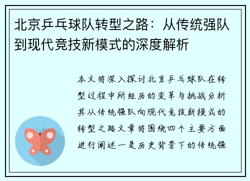 北京乒乓球队转型之路:从传统强队到现代竞技新模式的深度解析